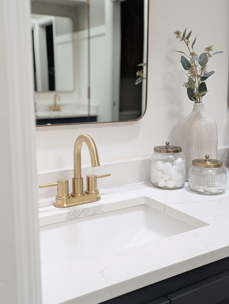 In complete transparency, my jaw dropped when I pulled both sets of faucets out of the box. They are even more elegant looking in person and definitely stand out from the rest of the builder’s-grade faucets in our home. The Corsica faucet is designed with sleek lines and a true matte black color, and the St. Lucia faucet embraces a more antique-inspired design especially with the champagne gold finish. Both of these faucets embody different vibes but are still timeless in their design truly making them perfect for any home design style.
